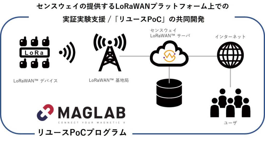 株式会社MAGLAB (本社:高知県高知市帯屋町、代表取締役:武市 真拓、以下MAGLAB)は、センスウェイ株式会社(東京都中央区、代表取締役 信藤薫、http://senseway.net 以下センスウェイ)が2017年11月6日に発表した計画においてLoRaWANを使った実証実験を拡大するに伴いその支援を行っていきます。LoRaWANプラットフォームの本格サービス開始後はこれらをベースとした「リユースPoC」も提供する予定です。