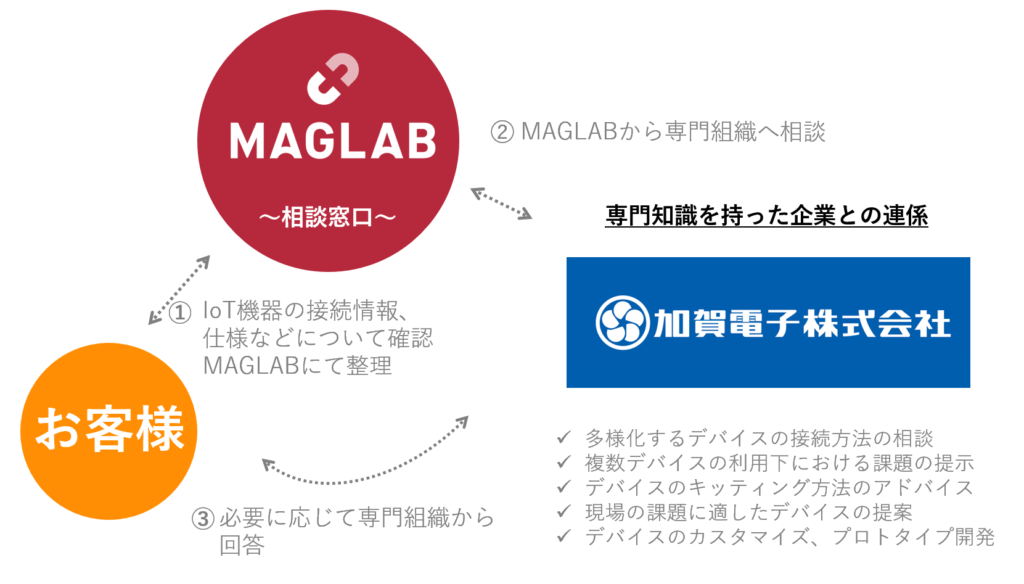 今回の共同運営は、MAGLABの注力するPoC(Proof of Conecpt:概念実証)段階において、課題解決のための専門窓口が少ないため、特に時間のかかりやすいデバイスの選定や調査時間を短縮することを狙った複数企業による専門窓口連係の第一弾です。